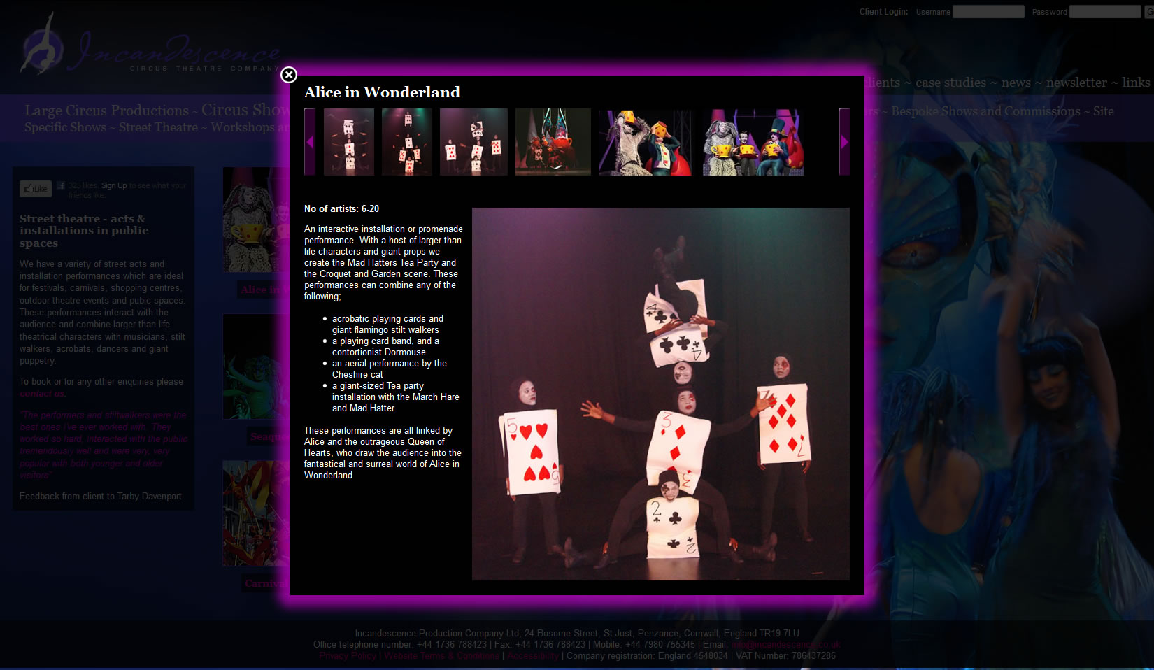 Company: Incandescence What they wanted to achieve: They wanted many things :) Firstly to be "branded" and secondly to have a website that would be both dazzling and more optimised for search engines. What we did: Working very closely with the client we created a fresh new identity that could tie together all their communications materials, together with a new website that they could update from a high wire in Hong Kong if necessary. How we did it: We chose an element from one of their performances to be the key brand identity, the hooped acrobat, and combined this with the use of rich backgrounds and a distinctive style. We worked extremely closely on every element with the client as the website had to represent their own style and performances. The website itself is a clever mix of bespoke database driven content and imagery that can be updated via the internet. How they maintain it: Customer own maintenance What they think of it: They specifically have said they want to write this... we are still waiting Satya, get off those high hoops and tap something out. Website: www.incandescence.co.uk Screenshots